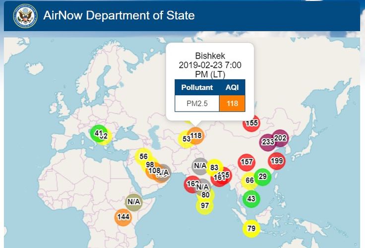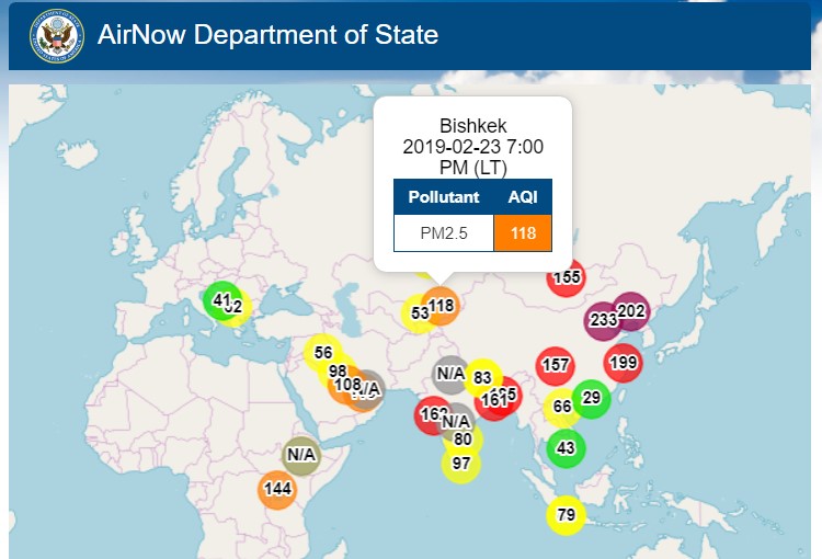 Посольство США в Кыргызстане также установило датчик, измеряющий уровень загрязнения воздуха. Информация обновляется ежечасно.