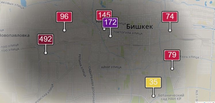 1. Жилмассив «Ак-Орго». Уровень загрязнения превышен в 6,65 раза: PM2.5 среднесуточный — 233 мкг/м³, на момент измерения — 492 мкг/м³.