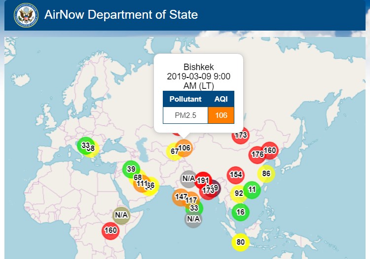 Посольство США в Кыргызстане также установило датчик, измеряющий уровень загрязнения воздуха. Информация обновляется ежечасно.