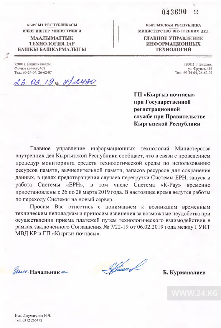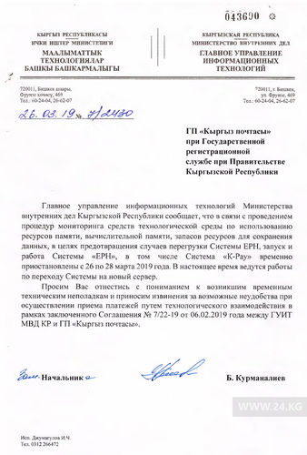 В письме указано, что с 26 по 28 марта временно приостановлены запуск и работа системы «ЕРН» и «K-Pay» в связи с проведением мониторинга средств технологической среды по использованию ресурсов памяти для сохранения данных.