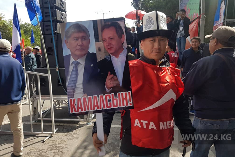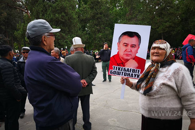 Участники акции протеста требуют оправдания и освобождения бывшего парламентария Омурбека Текебаева и экс-главы МЧС Дуйшенкула Чотонова.