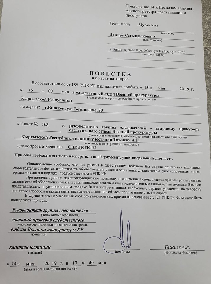 Военная прокуратура ранее возбудила уголовное дело по факту незаконного обогащения. Речь о недвижимости экс-главы Девятой службы ГКНБ Дамира Мусакеева. По версии следствия, с 2010 по 2017 год он приобрел жилья на 20 миллионов сомов.