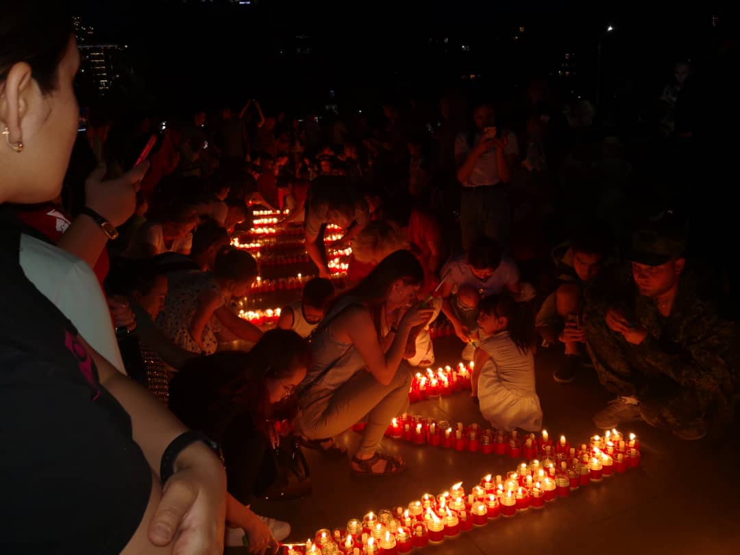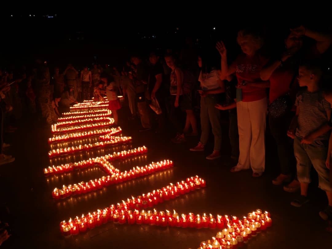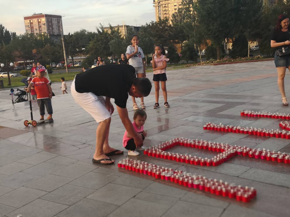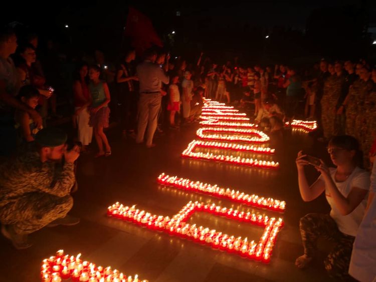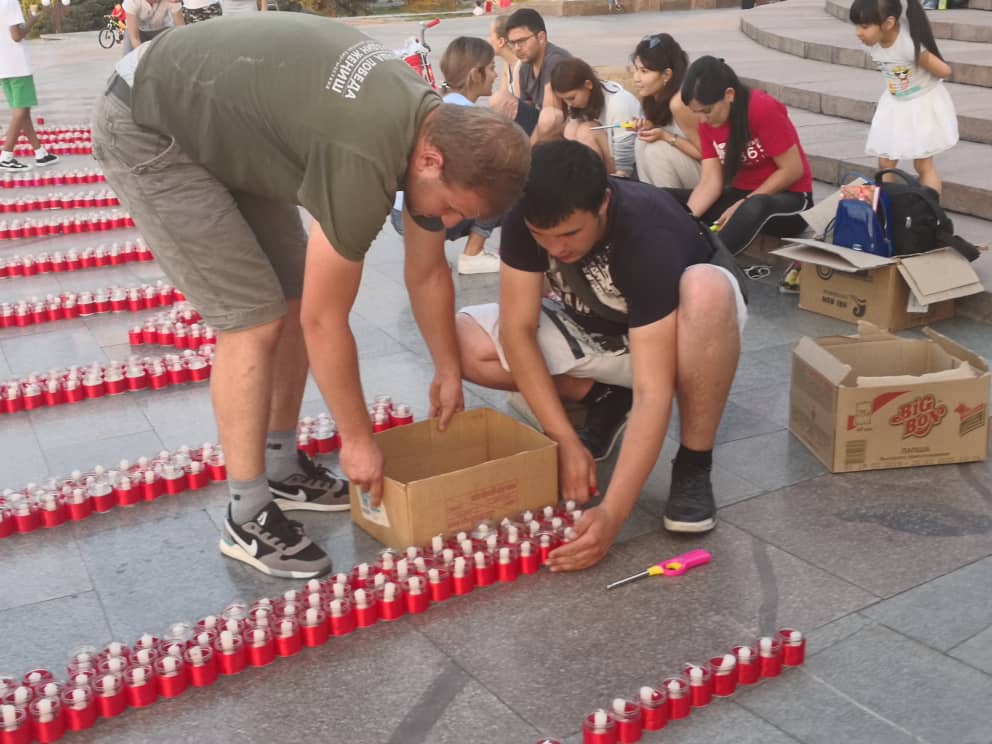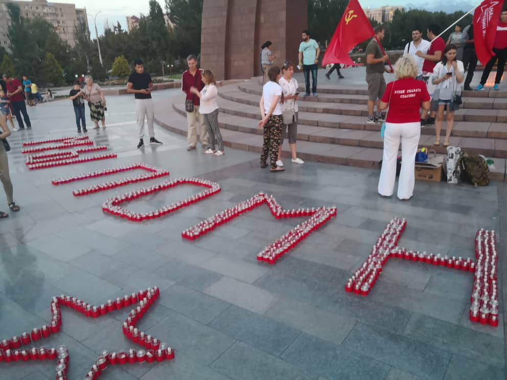 В Бишкеке на площади Победы прошла акция «Свеча памяти», приуроченная к 78-й годовщине начала Великой Отечественной войны. Участники выложили из свечей слова «Мы помним...» и звезду.