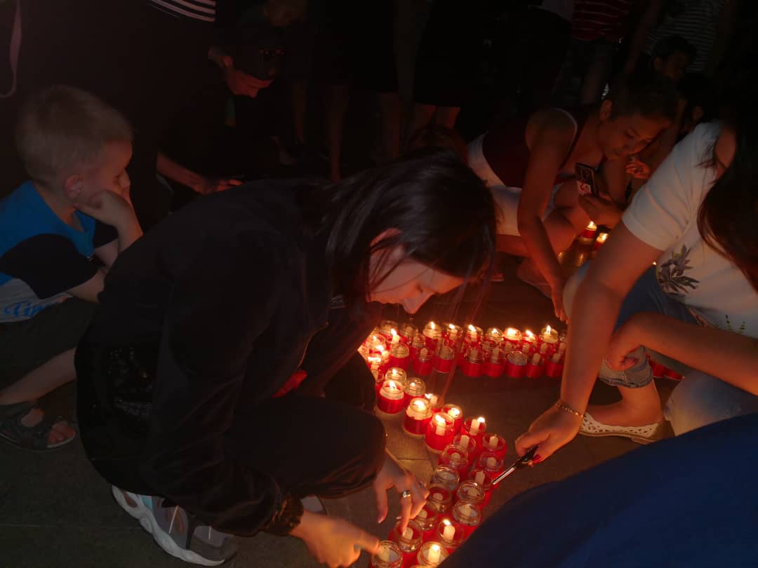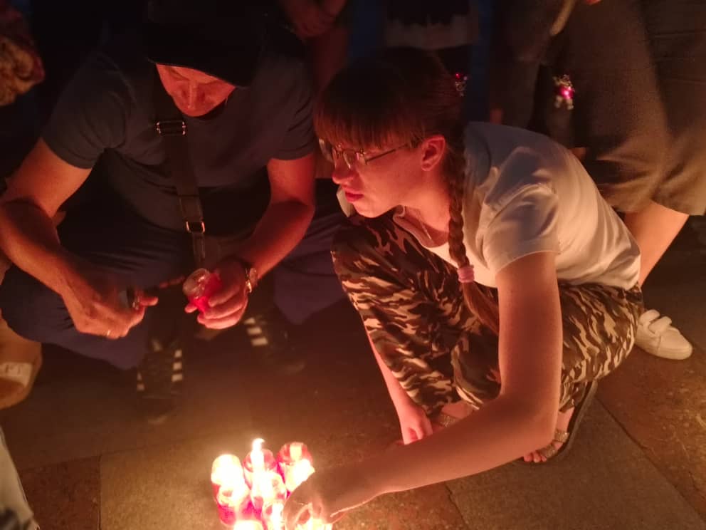 Мероприятие заинтересовало и тех, кто гулял на площади. К волонтерам то и дело подходили с вопросами, что происходит. Некоторые, узнав об акции памяти, решили остаться и дождаться 22.00. Именно в это время планировали начать зажигать свечи. Однако начавшийся дождь внес коррективы, передвинув начало почти на 40 минут.