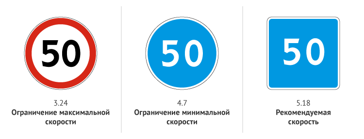 Это же касается и знаков 3.24 «Ограничение максимальной скорости», 4.7 «Ограничение минимальной скорости» и 5.18 «Рекомендуемая скорость». На знаке для примера указывается величина, однако меняется исходя от организации дорожного движения на участке дороги.