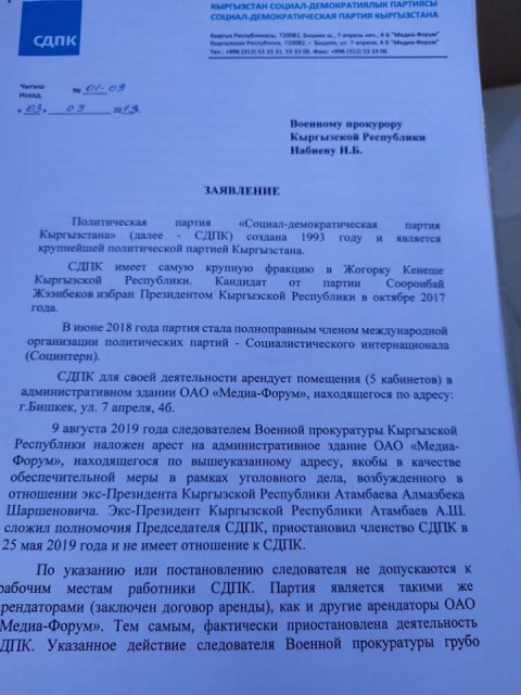 Кундуз Жолдубаева добавила, что государство гарантирует соблюдение прав и законных интересов партий. «Вмешательство государственных органов и должностных лиц в деятельность политических партий не допускается, за исключением случаев, предусмотренных законом. Прошу обеспечить конституционные права, условия для выполнения уставных задач и допуск СДПК к арендуемым помещениям в административном здании ОАО «Медиа Форум», — заключила она.