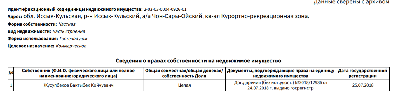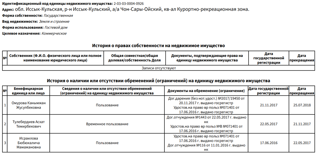 Еще несколько фактов приобретения имущества семьей Рената Тулебердиева обнаружилось в Иссык-Кульской области. Эта недвижимость принадлежала государству, находилась в ведении местных органов власти, а управлял ею ФУГИ. Ренат Тулебердиев руководил Фондом по управлению государственным имуществом с декабря 2017 года по август 2019-го.