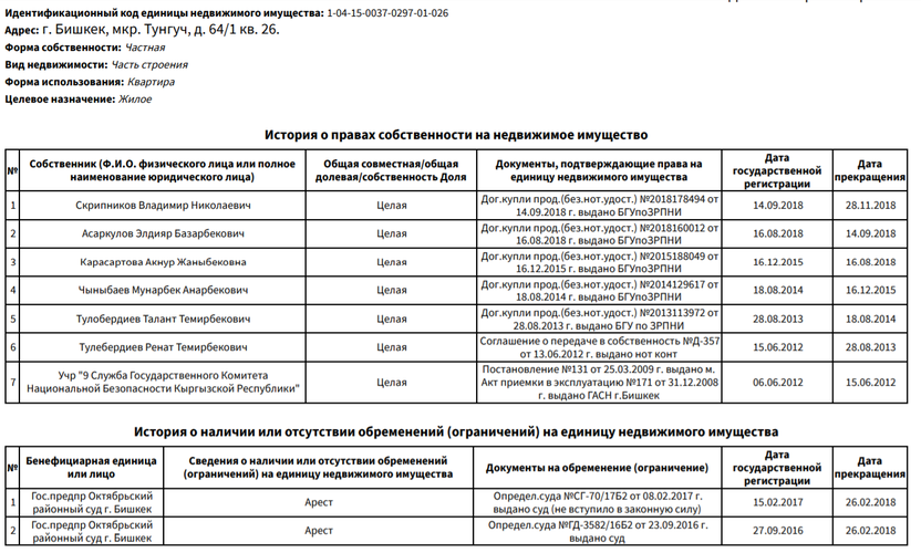 В 2013 году Ренат Тулебердиев эту служебную квартиру продал своему брату Таланту Тулебердиеву, в 2014-м недвижимость перешла в третьи руки, далее была еще трижды перепродана.