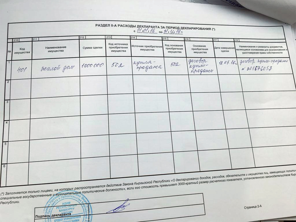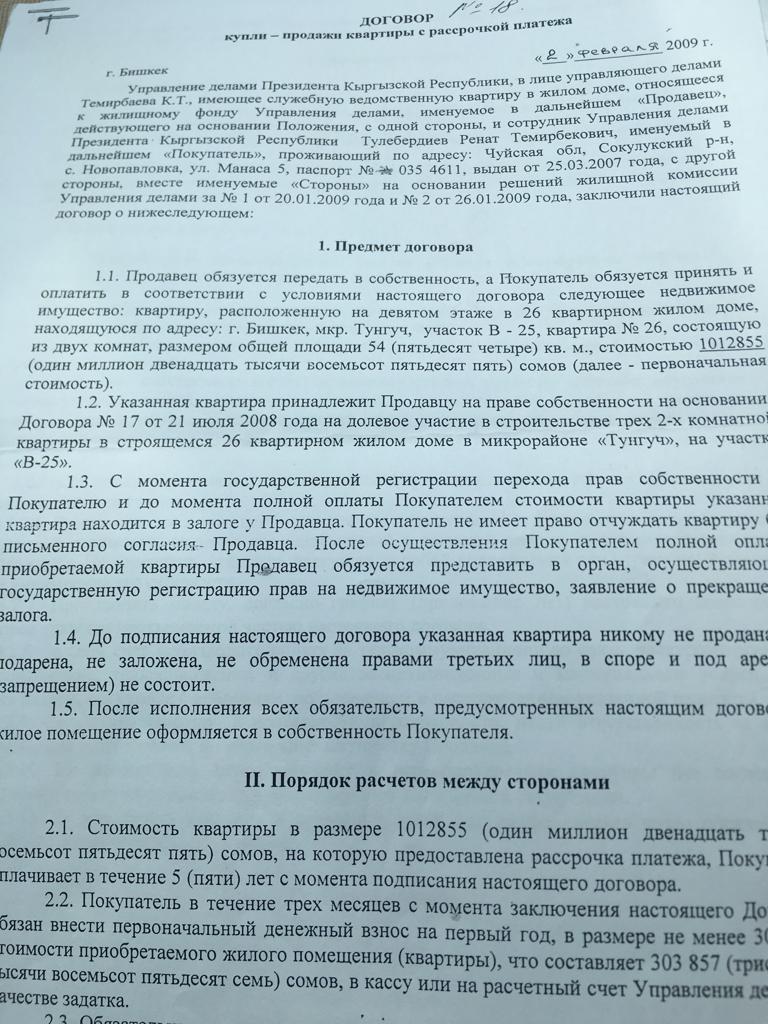 «В материале также указывается квартира в микрорайоне «Тунгуч». Я купил ее 2 февраля 2009-го по договору о долевом участии и расплачивался четыре года. Квартира на девятом этаже площадью 57 квадратов. Это не ведомственный дом. Есть декларации со всеми штампами и печатями. Что касается половины коттеджа на Иссык-Куле, то он принадлежит моим родственникам. Недвижимость временно была оформлена на моего брата», — сказал Ренат Тулебердиев.