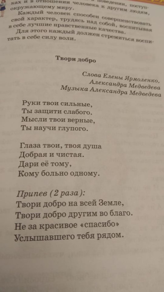 В Казахстане родители школьников обнаружили в учебнике «Самопознание» за 4-й класс текст песни «Твори добро» российского исполнителя Шуры, сообщает zakon.kz.