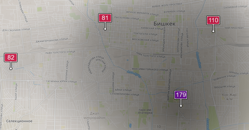 - жилмассив «Ак-Орго». Уровень загрязнения превышен в три раза: PM2.5 среднесуточный — 109 мкг/м³, на момент измерения — 82 мкг/м³.