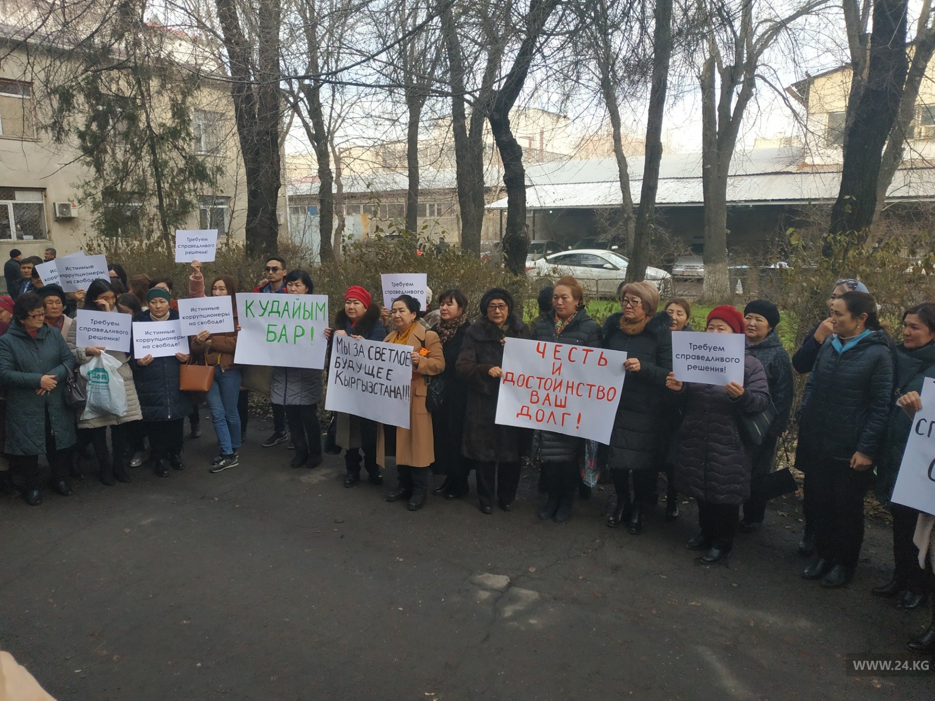 Сторонники подсудимых вышли во двор и развернули плакаты с требованием справедливого решения.