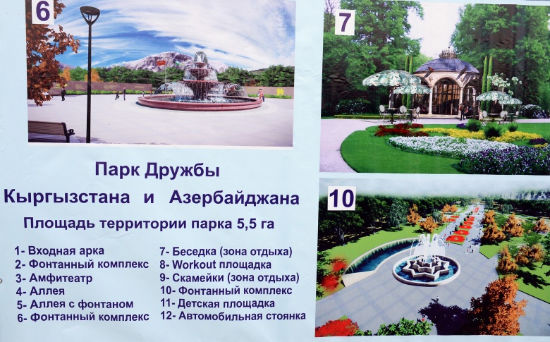 По данным мэрии Бишкека, Парк дружбы Кыргызстана и Азербайджана расположится на территории 5,5 гектара. В нем установят фонтаны, искусственные бассейны, открытый амфитеатр, детские площадки и многое другое.