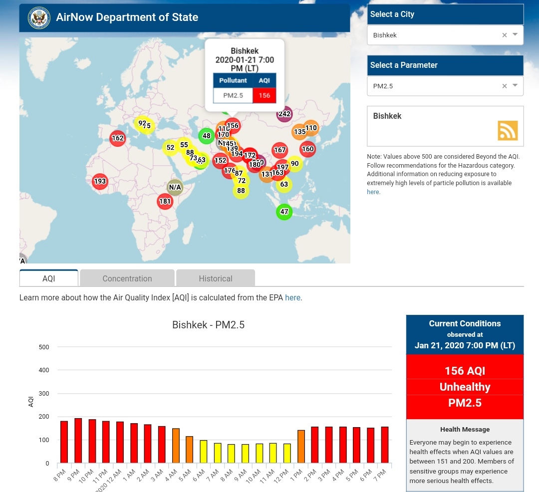 Посольство США в Кыргызстане также установило датчик. Он показывает индекс качества воздуха в режиме онлайн. Информация обновляется ежечасно.