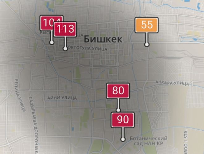 • в районе улиц Бейшеналиевой/Токтогула. Уровень загрязнения превышен в три раза: PM2.5 среднесуточный — 105 мкг/м³, на момент измерения — 104 мкг/м³;