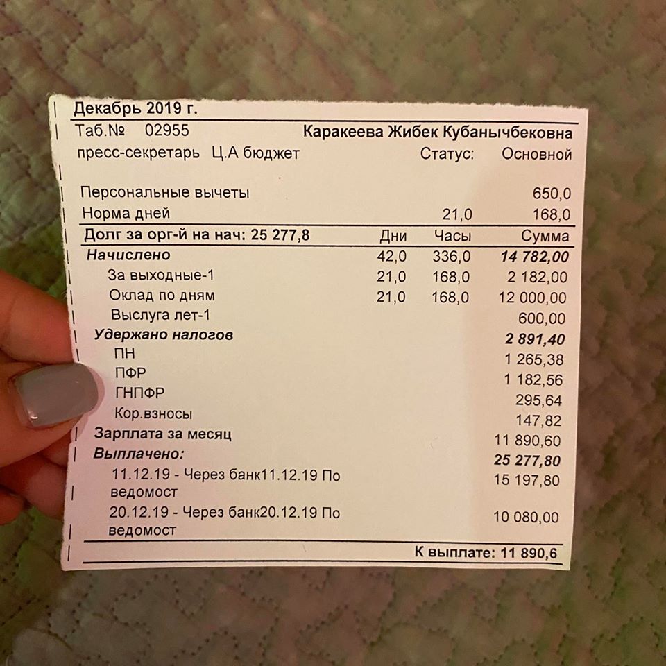 О том, какие на самом деле зарплаты в МП «Тазалык», рассказала Жибек Каракеева. Она заявила, что ее оклад составляет 11 тысяч 890 сомов.
