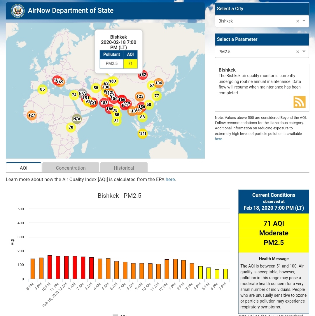 Посольство США в Кыргызстане также установило датчик. Он показывает индекс качества воздуха в режиме онлайн. Информация обновляется ежечасно.