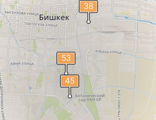 - в районе улиц Жукеева-Пудовкина/Койбагарова. Уровень загрязнения превышен в 1,97 раза: PM2.5 среднесуточный — 69 мкг/м³, на момент измерения — 53 мкг/м³;