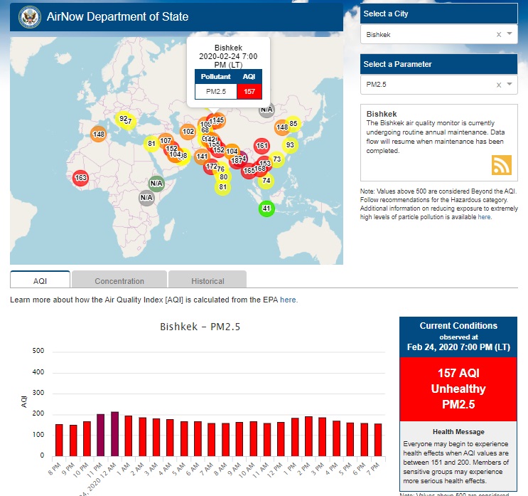 Посольство США в Кыргызстане также установило датчик. Он показывает индекс качества воздуха в режиме онлайн. Информация обновляется ежечасно.