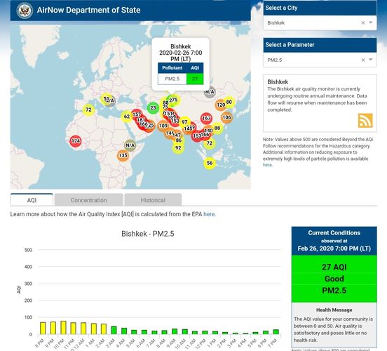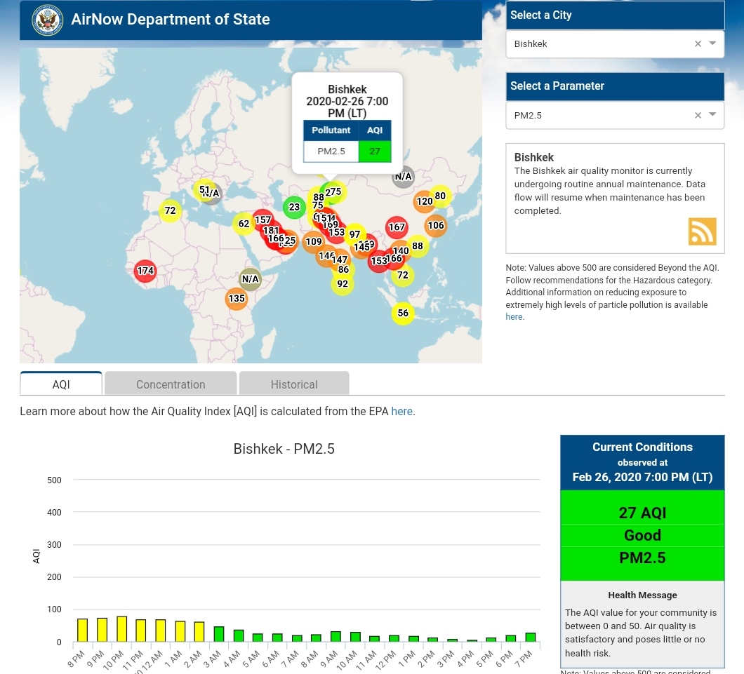 Посольство США в Кыргызстане также установило датчик. Он показывает индекс качества воздуха в режиме онлайн. Информация обновляется ежечасно.