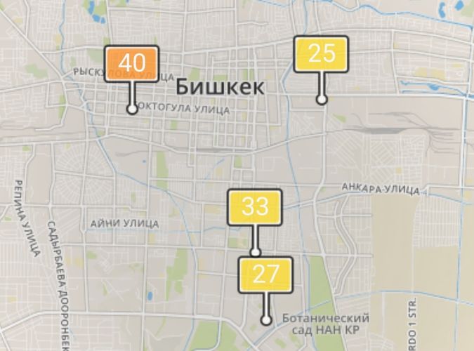 По нормам ВОЗ среднегодовой уровень РМ2.5 должен составлять не больше 10 мкг/м³, а среднесуточный — не больше 25 мкг/м³. В национальном законодательстве КР — 35 мкг/м³. Именно он взят для расчетов. Разовая допустимая концентрация, по данным «МувГрин», установленная в национальном законодательстве, — 160 мкг/м³.