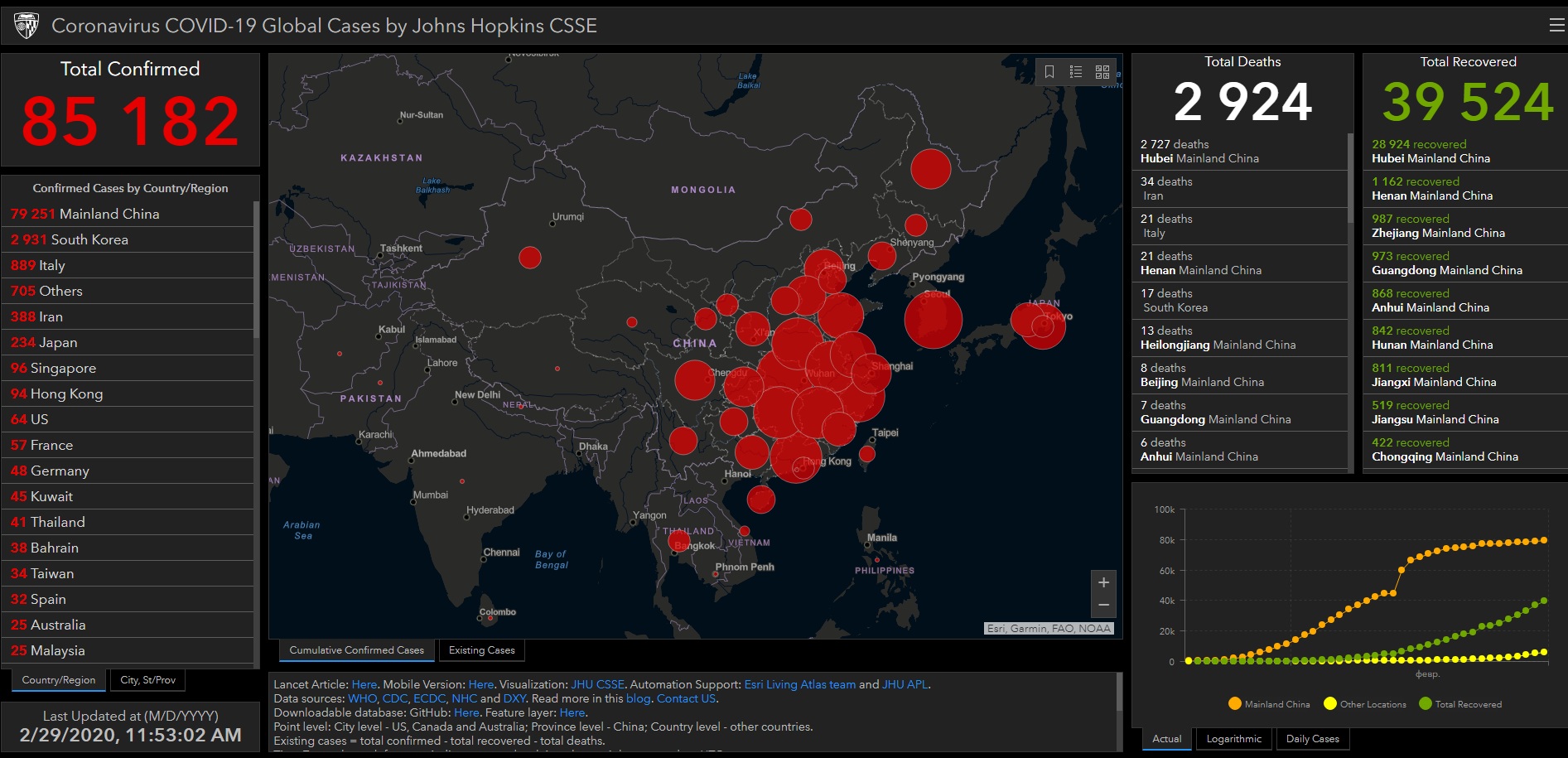 Общее число заразившихся новым коронавирусом достигло 85 тысяч 182 человек. Об этом свидетельствуют данные онлайн-карты, разработанной учеными.