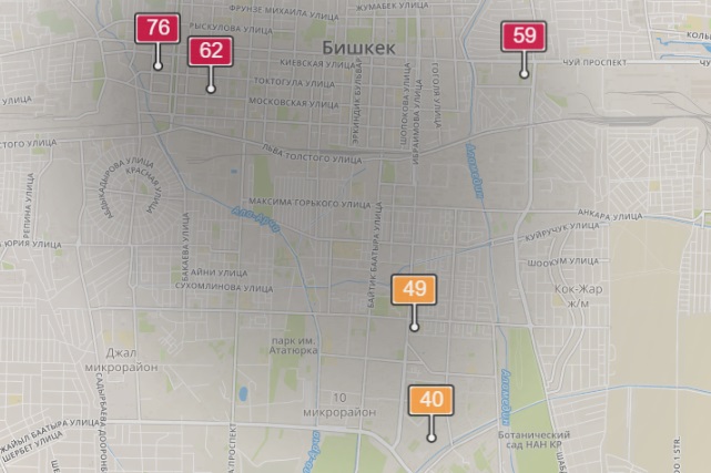 - в районе улиц Бейшеналиевой/Токтогула. Уровень загрязнения превышен в 2,77 раза: PM2.5 среднесуточный — 97 мкг/м³, на момент измерения — 76 мкг/м³;