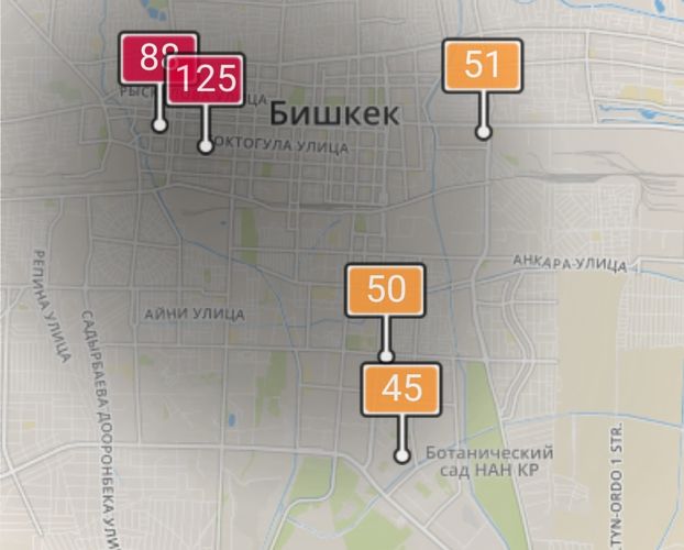 - в районе улиц Бейшеналиевой/Токтогула. Уровень загрязнения превышен в 2,37 раза: PM2.5 среднесуточный — 83 мкг/м³, на момент измерения — 88 мкг/м³;