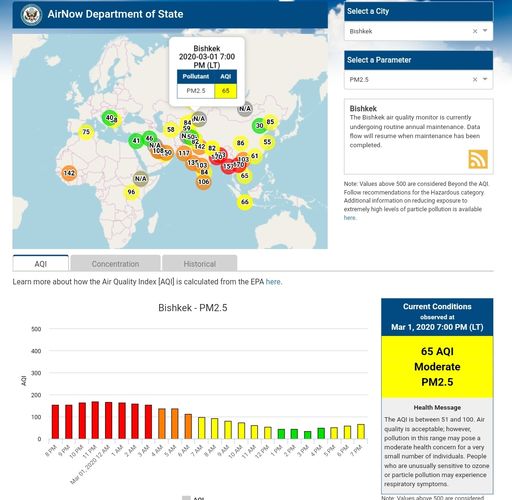 Посольство США в Кыргызстане также установило датчик. Он показывает индекс качества воздуха в режиме онлайн. Информация обновляется ежечасно.