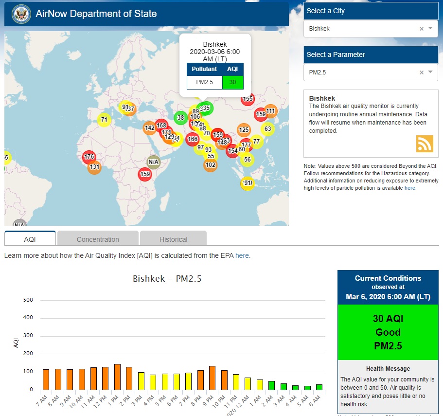 Посольство США в Кыргызстане также установило датчик. Он показывает индекс качества воздуха в режиме онлайн. Информация обновляется ежечасно.