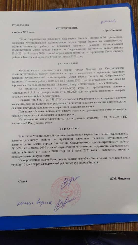 Свердловский районный суд вернул исковое заявление администрации района о временном запрете на проведение митингов. Информацию 24-kg.com подтвердили в мэрии Бишкека.