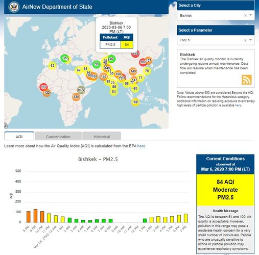 Посольство США в Кыргызстане также установило датчик. Он показывает индекс качества воздуха в режиме онлайн. Информация обновляется ежечасно.