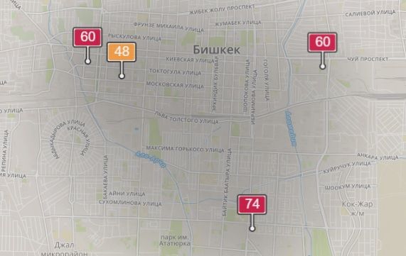 - в районе улиц Бейшеналиевой/Токтогула. Уровень загрязнения превышен в 1,4 раза: PM2.5 среднесуточный — 49 мкг/м³, на момент измерения — 60 мкг/м³;