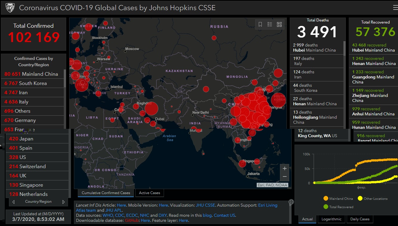На сегодня число людей, заразившихся новым коронавирусом, составляет 102 тысячи 169 человек. Об этом свидетельствуют данные онлайн-карты, разработанной учеными.