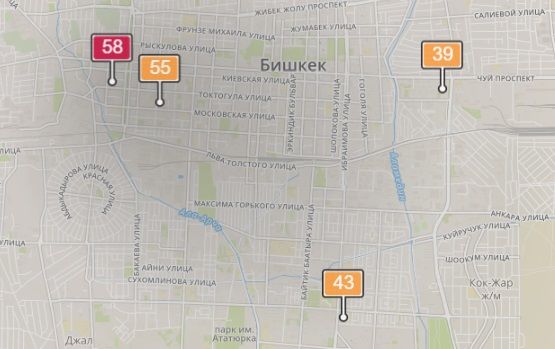 - в районе улиц Бейшеналиевой/Токтогула. Уровень загрязнения превышен в 1,25 раза: PM2.5 среднесуточный — 44 мкг/м³, на момент измерения — 58 мкг/м³;