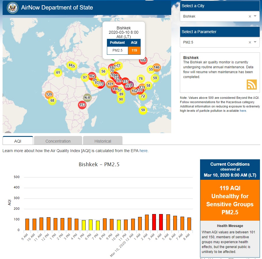 Посольство США в Кыргызстане также установило датчик. Он показывает индекс качества воздуха в режиме онлайн. Информация обновляется ежечасно.