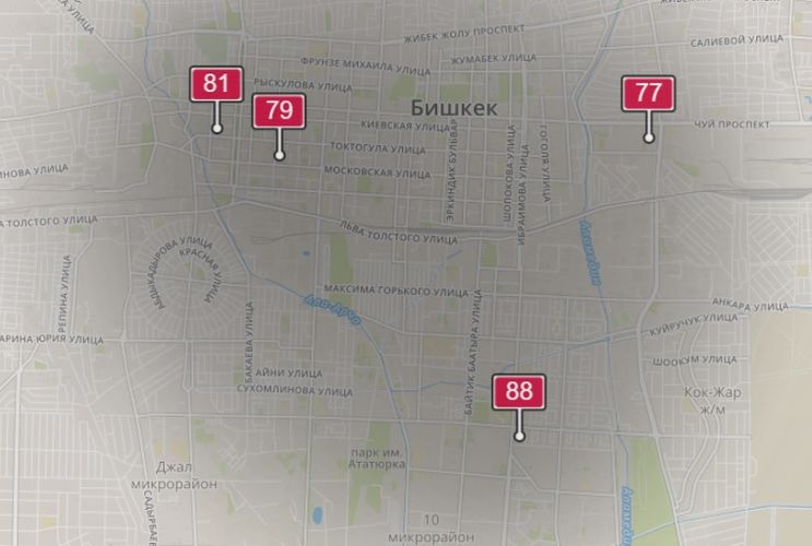 - в районе улиц Бейшеналиевой/Токтогула. Уровень загрязнения превышен в 2,23 раза: PM2.5 среднесуточный — 78 мкг/м³, на момент измерения — 81 мкг/м³;