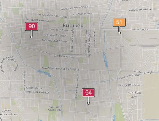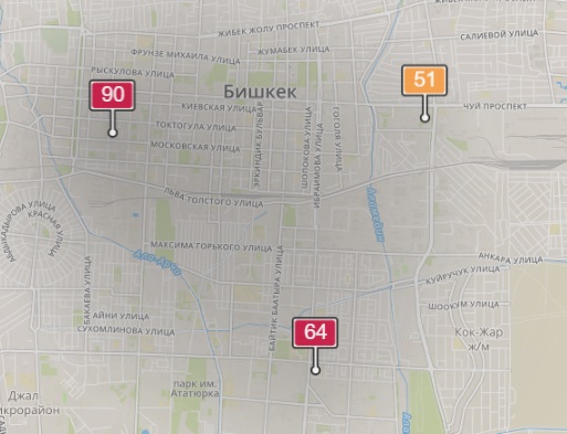 • в районе улиц Московской/Уметалиева. Уровень загрязнения превышен в 1,69 раза: PM2.5 среднесуточный — 59 мкг/м³, на момент измерения — 90 мкг/м³;