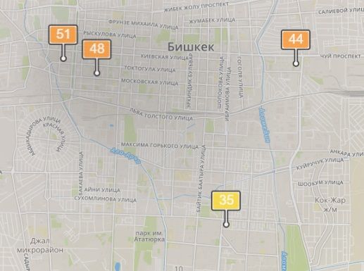 - в районе улиц Бейшеналиевой/Токтогула. Уровень загрязнения не превышен: PM2.5 среднесуточный — 33 мкг/м³, на момент измерения — 51 мкг/м³;