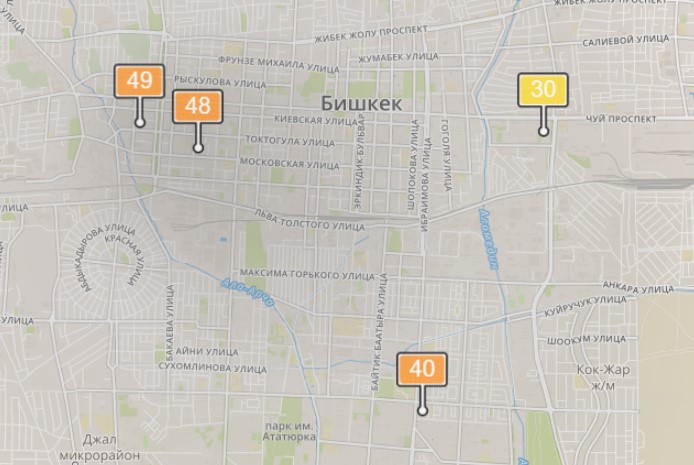 - в районе улиц Бейшеналиевой/Токтогула. Уровень загрязнения превышен в 1,17 раза: PM2.5 среднесуточный — 41 мкг/м³, на момент измерения — 49 мкг/м³;