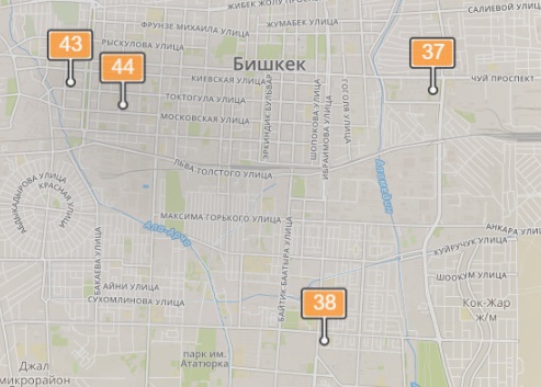 - в районе улиц Бейшеналиевой/Токтогула. Уровень загрязнения превышен в 1,54 раза: PM2.5 среднесуточный — 54 мкг/м³, на момент измерения — 43 мкг/м³;