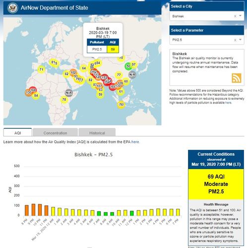 Посольство США в Кыргызстане также установило датчик. Он показывает индекс качества воздуха в режиме онлайн. Информация обновляется ежечасно.