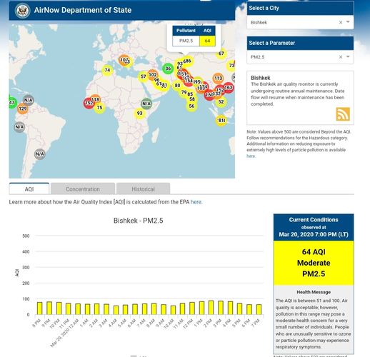 Посольство США в Кыргызстане также установило датчик. Он показывает индекс качества воздуха в режиме онлайн. Информация обновляется ежечасно.