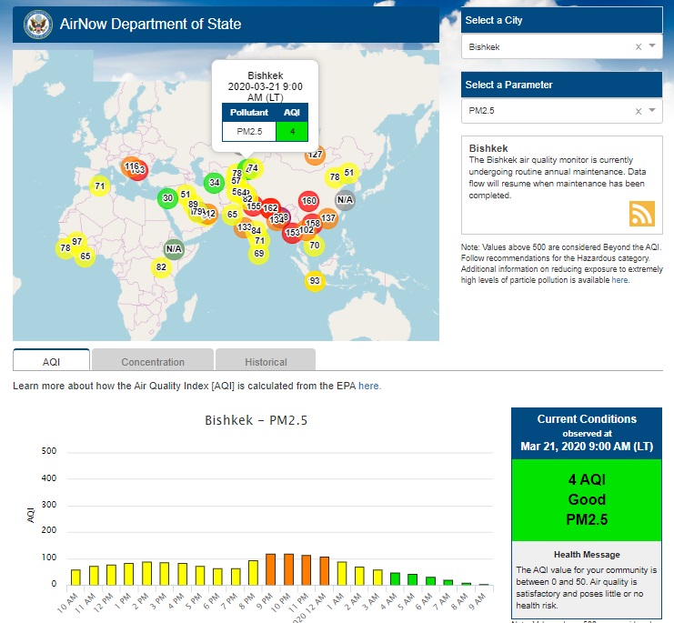 Посольство США в Кыргызстане также установило датчик. Он показывает индекс качества воздуха в режиме онлайн. Информация обновляется ежечасно.