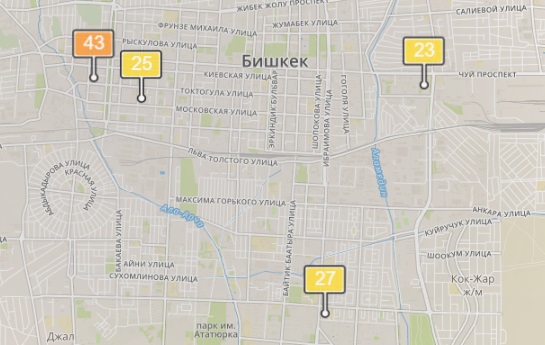 • в районе улиц Бейшеналиевой/Токтогула. Уровень загрязнения превышен в 1,23 раза: PM2.5 среднесуточный — 43 мкг/м³, на момент измерения — 43 мкг/м³;