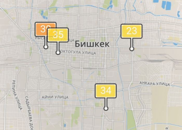- в районе улиц Бейшеналиевой/Токтогула. Уровень загрязнения превышен незначительно: PM2.5 среднесуточный — 36 мкг/м³, на момент измерения — 39 мкг/м³;