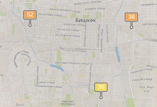 - в районе улиц Бейшеналиевой/Токтогула. Уровень загрязнения превышен в 2,17 раза: PM2.5 среднесуточный — 76 мкг/м³, на момент измерения — 52 мкг/м³;