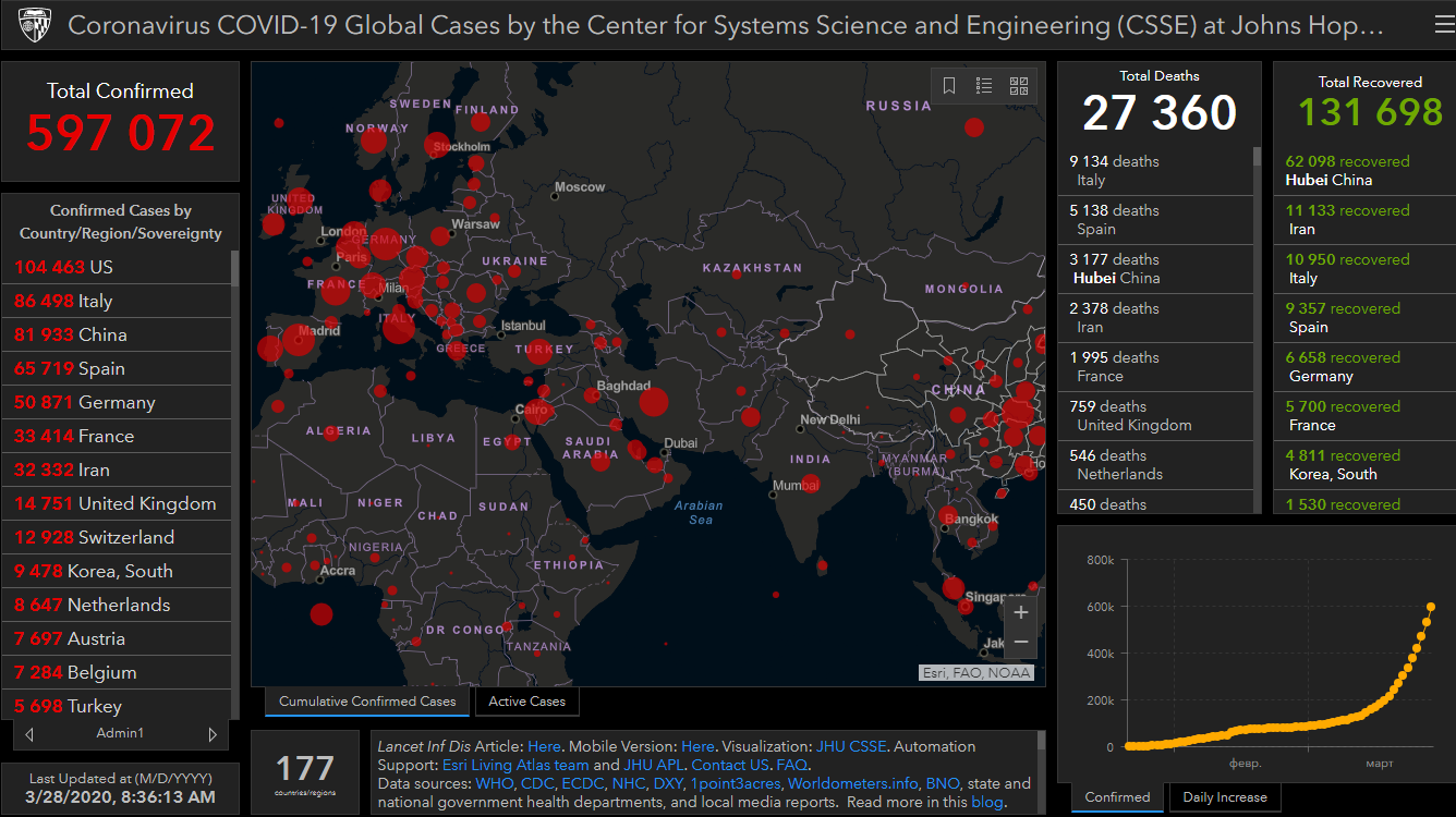 На сегодня в мире коронавирусом заразились 597 тысяч 72 человека. За сутки показатель вырос сразу на 65 тысяч 212 человек. Вне Китая зафиксировали 593,3 тысячи случаев, а в самой республике — 81 тысячу 933.
