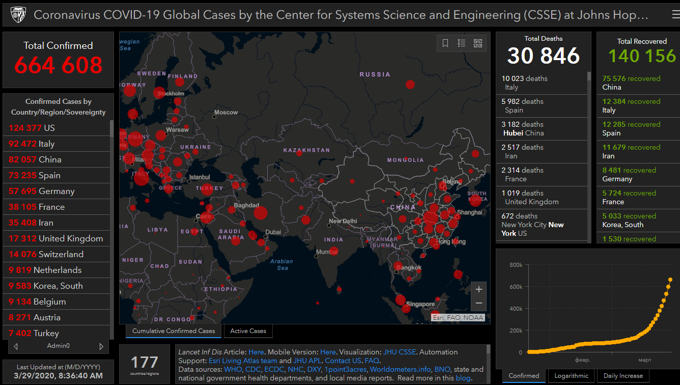 На сегодня в мире коронавирусом заразились 664 тысячи 608 человек. Вне Китая зафиксировали 660,7 тысячи случаев, а в самой республике — 82 тысячи 57.