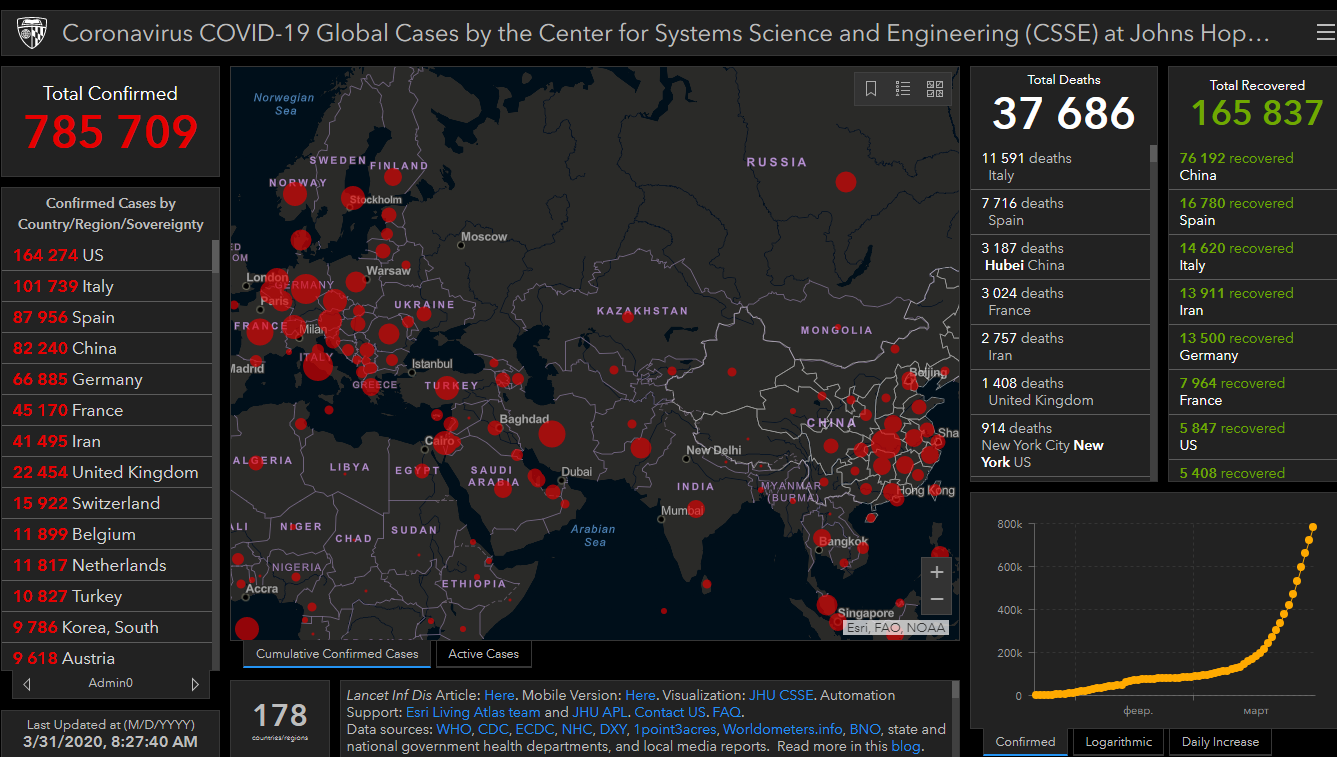 После заражения коронавирусом скончались 37 тысяч 686 человек (рост на 3 тысячи 718 за сутки). В том числе в Италии умерли 11 тысяч 591 человек, Испании — 7 тысяч 716, Хубэе — 3 тысячи 187.В Кыргызстане зарегистрировали 94 случая заражения коронавирусом, Казахстане — 308 случаев, Узбекистане — 149. Все эти государства закрыли границы, чтобы не допустить распространения вируса. Из стран Центральной Азии вируса пока нет только в Таджикистане и Туркменистане.